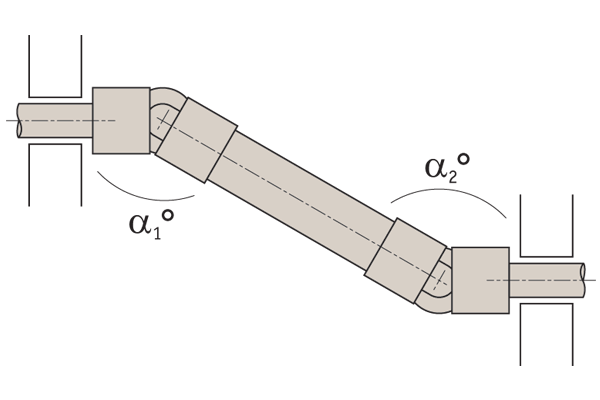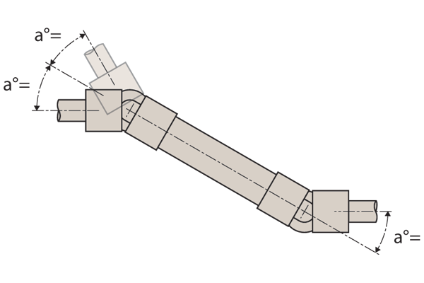 The difference between the maximum and the minimum speed of the driven shaft depends on the angle formed by the two shafts. The difference grows with an increase of the angle a°. To have homokinetic transmission, either two opposite single joints (ensuring that the two central yokes lie on the same plane and the angles are equal) or double joint need to be fitted. The irregularity caused by the former articulation is cancelled by the latter. The overall length resulting from the coupling of the two single joints can be reduced by using a double joint. In other words, the double joint is to be considered as the shortest homokinetic transmission.
