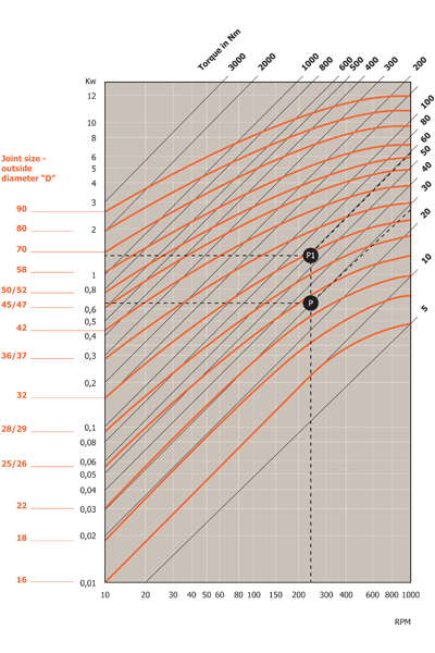 With working angle a 30°, F = 0,45 (kW 0.65: 0.45 = 1.44 kW) we get point P1 Torque = 60 Nm corresponding to joint size "D" = 32mm = Types R3688.020 and R3689.016