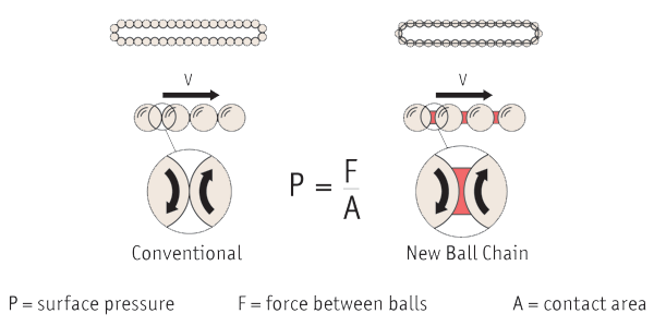 The new ball chain system also allows the balls to be continuously supplied with lubricant, which reduces wear of the metal. This significantly extends the service life of the system and reduces lubricant and the maintenance intervals.