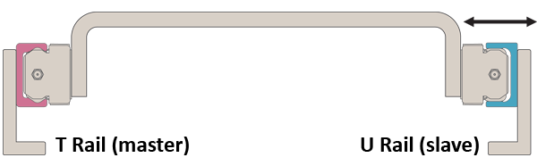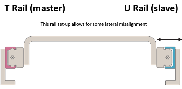 The rails are easy to set up and can adjust for some misalignment of the structure on which it is being used. The compact rail system achieves this by using a master (T type) rail, and a slave (U type) rail. This allows the sliders in the T rail to remain fixed in place but allows lateral movement of the sliders in the U rail to adapt to any misalignment and avoid any issues of stiction.