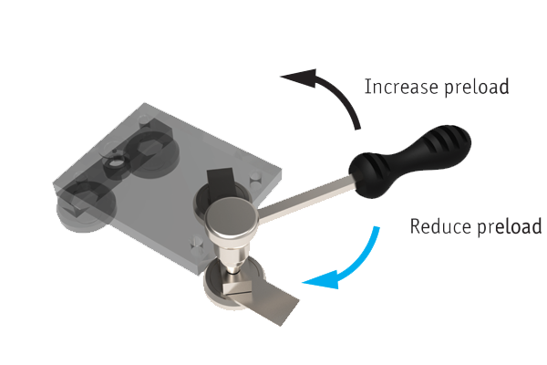 The sliders have eccentric rollers that are adjustable with the thin spanner that is supplied with them. This allows the preload of the system to be set as required – tight or free running.