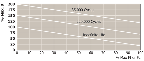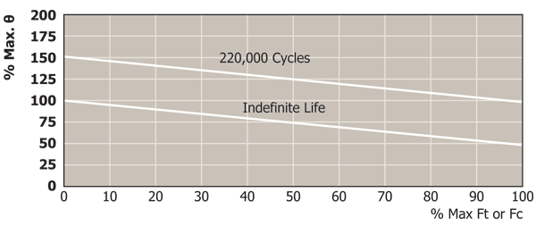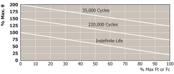 The cycle life of the bearings is based on the fatigue limit of the springs. The graphs below show the life expectancy for Torsional Spring Rates for Series 10, 20 and 30. Max θ shows the angle of deflection. This is the deflection angle from the null position, which can be positive or negative.