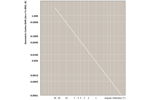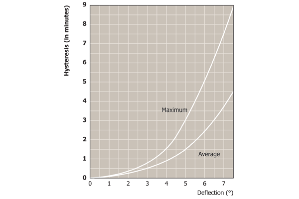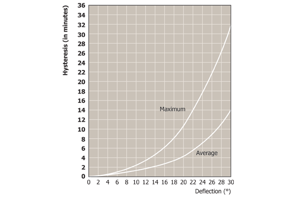 The linearity of the bearings (being the rotational defl ection of the pivot v the torque required to induce the deflection) is relatively constant for angles of rotation up to 15°. We define hysteresis as the diff erence between the zero position when the bearing is deflected to a plus angle then relieved and then defl ected to a negative angle then relieved. Comparing these two positions is the angle of hysteresis (see graphs below).