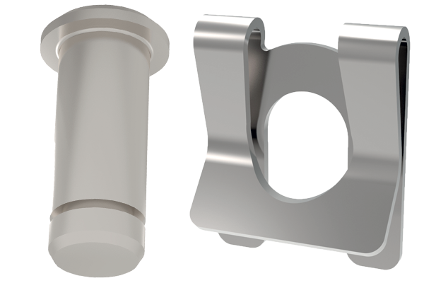 Safety fasteners in silver plated zinc, used with R3450 clevis pins, R3385 clevis joints that are installed and removed without additional hand tools. An ideal solution that replaces circlips.