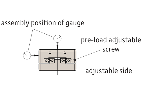 7. Return the table back to centre and lock the preload adjusting screw slightly. Adjust the clearance of table to zero. For fi nal adjustment of preload, set correct torque value with a torque wrench and prepare to lock the rail fixing screw.