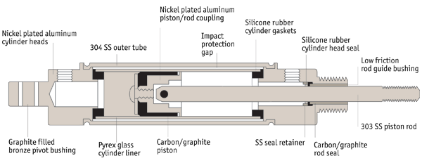 The Anti-Stiction Air Cylinders use a precision fit graphite piston which slides freely, without lubrication, inside a glass cylinder. No corrosion and no need for lubrication - our glass cylinders are encased in a stainless steel sleeve with a small space in between which provides excellent impact protection, so much so that the outside wall can be dented without affecting the glass liner. If you dent a conventional air cylinder, you can expect its operation to be severely impaired because the piston rides against the exposed cylinder. They can operate at extreme temperatures, at very high speeds and cycle rates. They also run cleaner than typical air cylinders as they contain no oil or grease. They have no rubber or plastic seals to wear out or harden with time.
