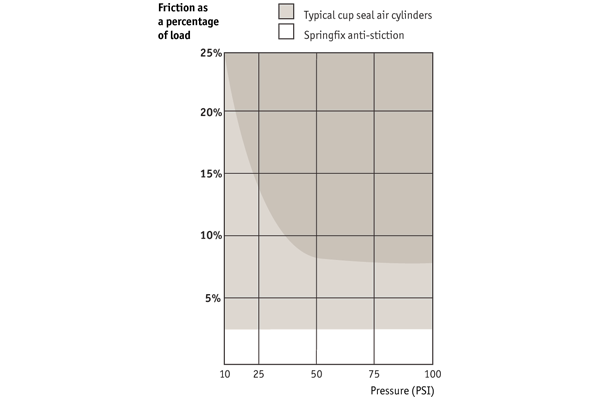 Stiction is the problem that causes air cylinders to stick at the start of the stroke - resulting in erratic breakaway motion. Technically it’s the difference between static friction and moving friction when static friction is higher. Our Anti-Stiction Air Cylinders do away with any perceptible stiction and reduces running friction to exceedingly low levels. This gives them the unique ability to impart super smooth motion, smoother than any other air cylinder.