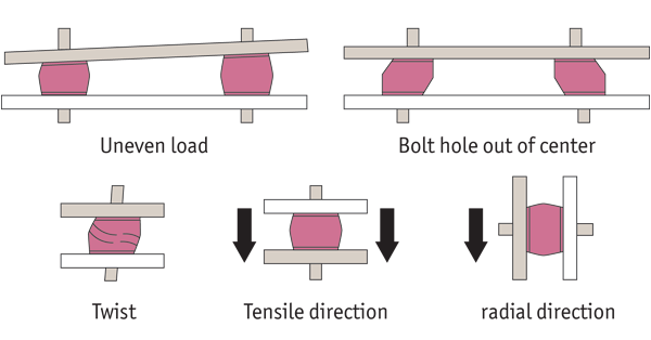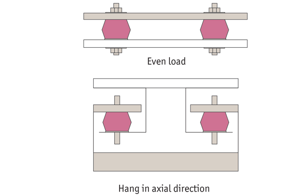 Cylindrical mounts are never to be used in tension. They should only be used in axial or radial. However radial loads are also considerably less than axial loads. Parts with small diameters (d1) and relatively long lengths (h) cannot accept radial loads.